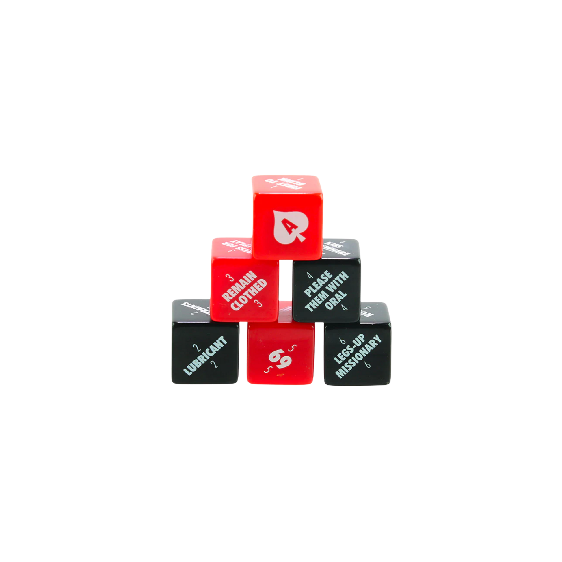 Die 1: who will take the lead and intimately intimacy? Roll the Ace to fix all dice to your own desire! Die 2: What props can be utilized to enhance play? Die 3: How you'll be attired for your erotic exploits? Die 4: What foreplay will help you get in the mood? Die 5: What position will get the passion rising? Die 6: switch to this position as you approach climax!