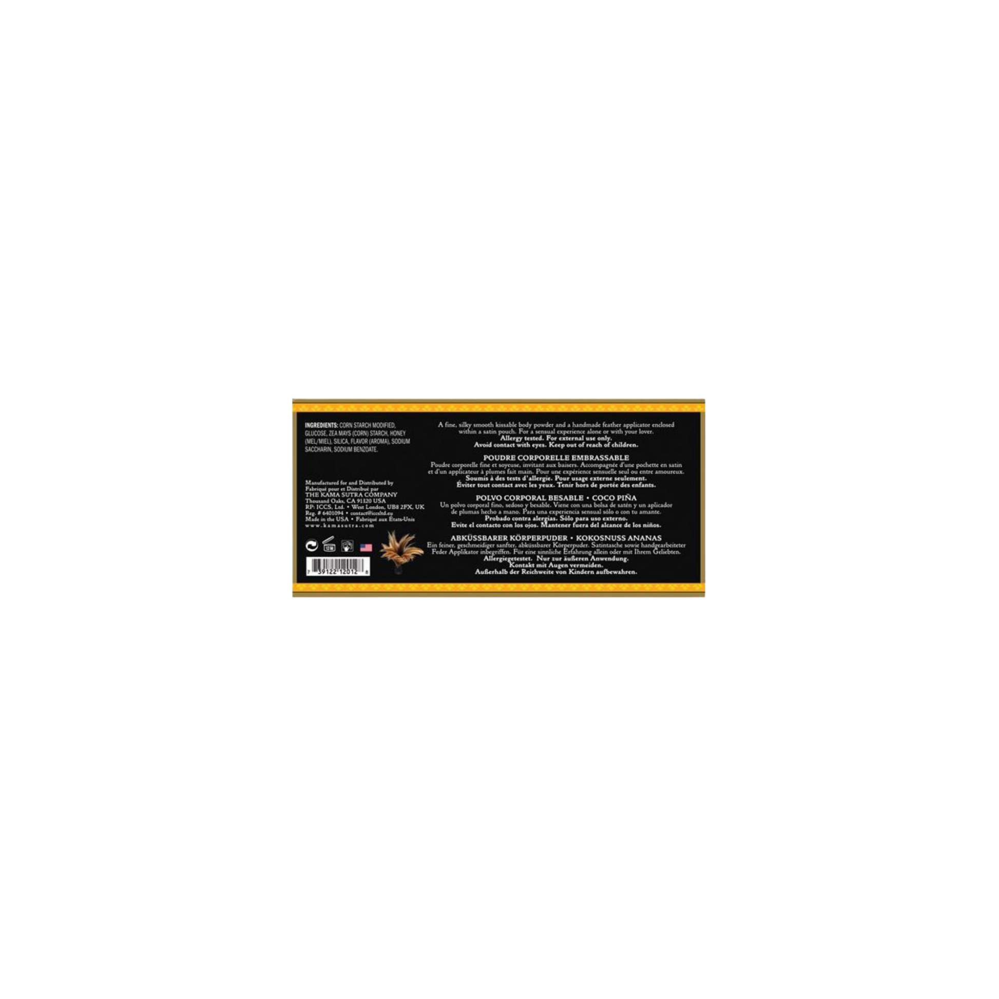 Use the included feather applicator to lightly dust Honey Dust onto desired areas of the body. Kiss or gently blow to intensify arousal and create a sensual experience.