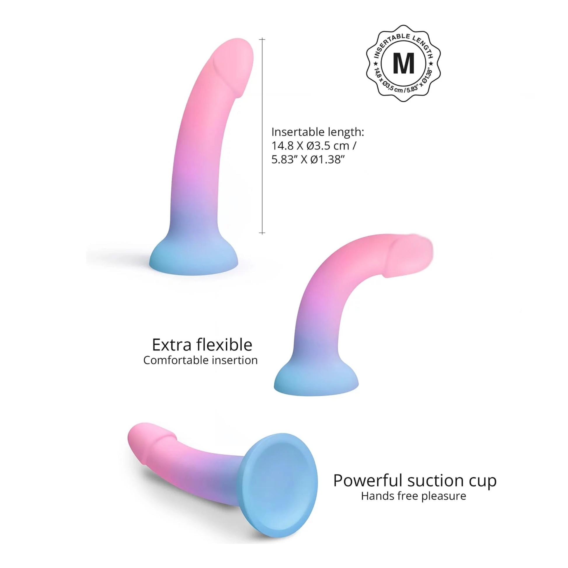 Made entirely of soft and flexible "liquid" silicone, Utopia offers a soft touch and comfortable penetration with a curved design, and is available in multiple sizes. This is a gorgeous toy with a ombre blue-to-pink color. It's somewhat translucent, and comes in a holographic storage cylinder. With its strong suction cup base, feel free to use Utopia hands free, anywhere you want. The wide suction base also allows for both vaginal and backdoor use, and is harness compatible.