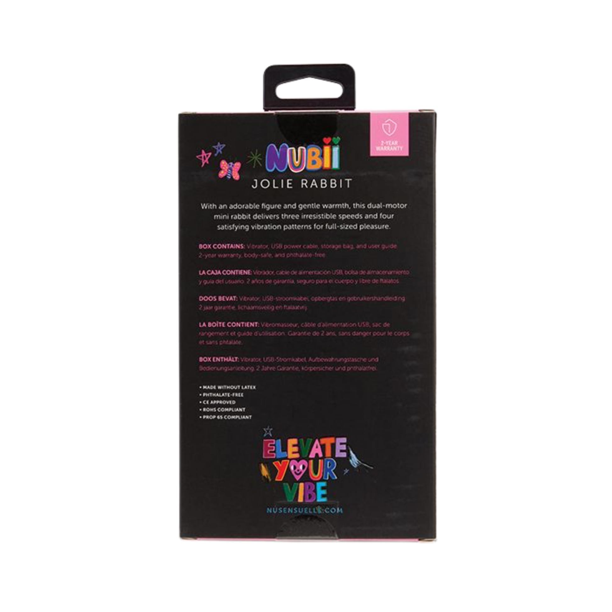 Put a bounce into your step by indulging in the sensuous warmth of our seductive Nubii Jolie Mini Rabbit. With an adorable figure, this dual-motor mini rabbit bullet vibrator from Nu Sensuelle delivers three irresistible speeds and four satisfying vibration patterns for luxurious thrills. Kick in the independently controlled warming function and hop to new heights in ecstasy as you surrender to Jolie's seductive charm. The rabbit's petite size makes for the ideal travel companion that will undoubtedly provide full-sized pleasure no matter where you are in the world!