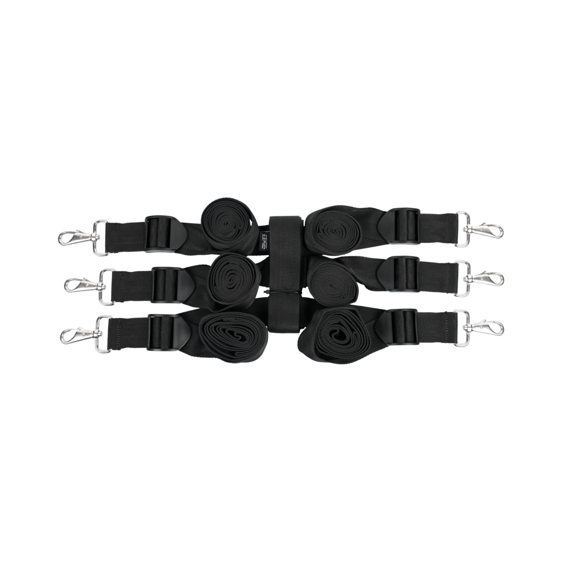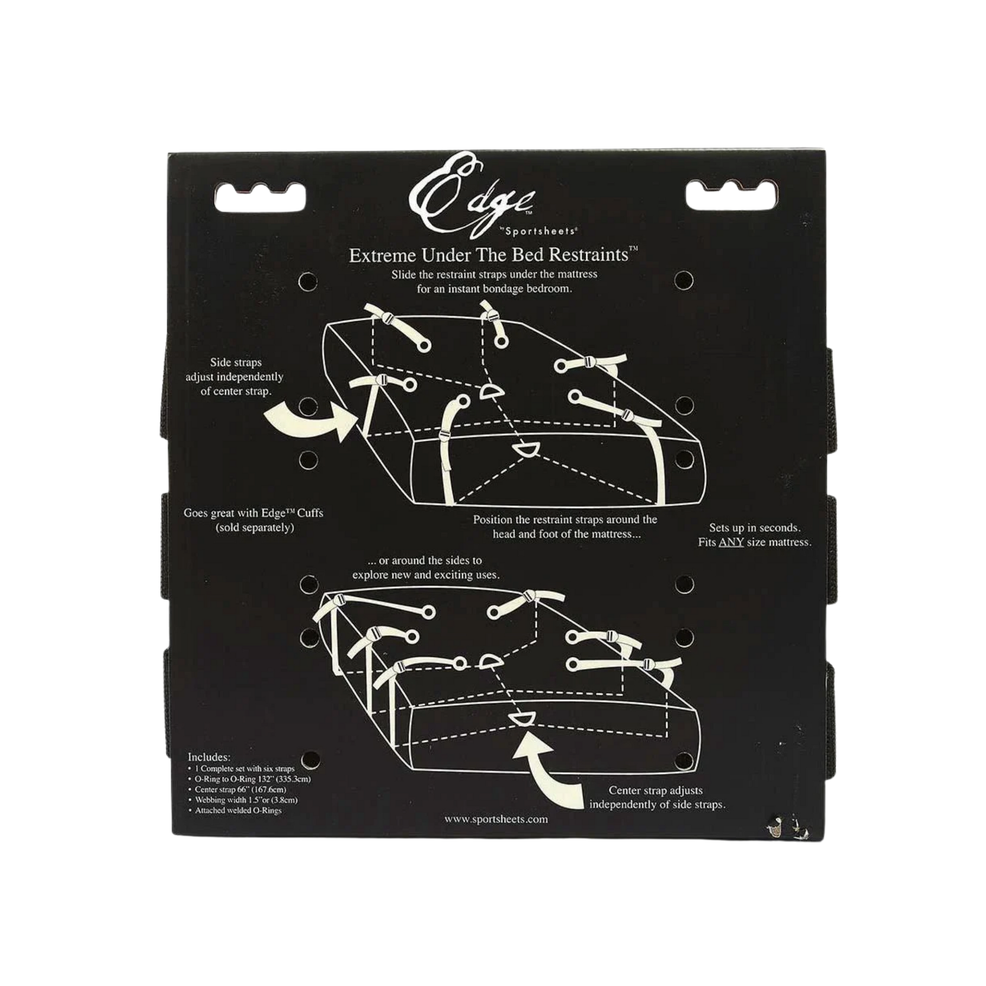Unleash your deepest desires and dominate your lover with the Edge® Extreme Under the Bed® Restraint System. This quick-to-install bed bondage system transforms any bed into a dungeon of pleasure in minutes. Secure those limbs and take control, turning your partner's body into your personal playground. Perfect for home or on-the-go adventures, this versatile system fits any size mattress and can even be used around some doors. With six points of connection, you can attach cuffs, a collar, and more to create your ultimate fantasy scenario. The easy-on push clips promise unmatched strength and durability, ensuring your captive remains firmly in place no matter how wild your play becomes. Get ready to push the limits and indulge in the ultimate power exchange with Edge®.