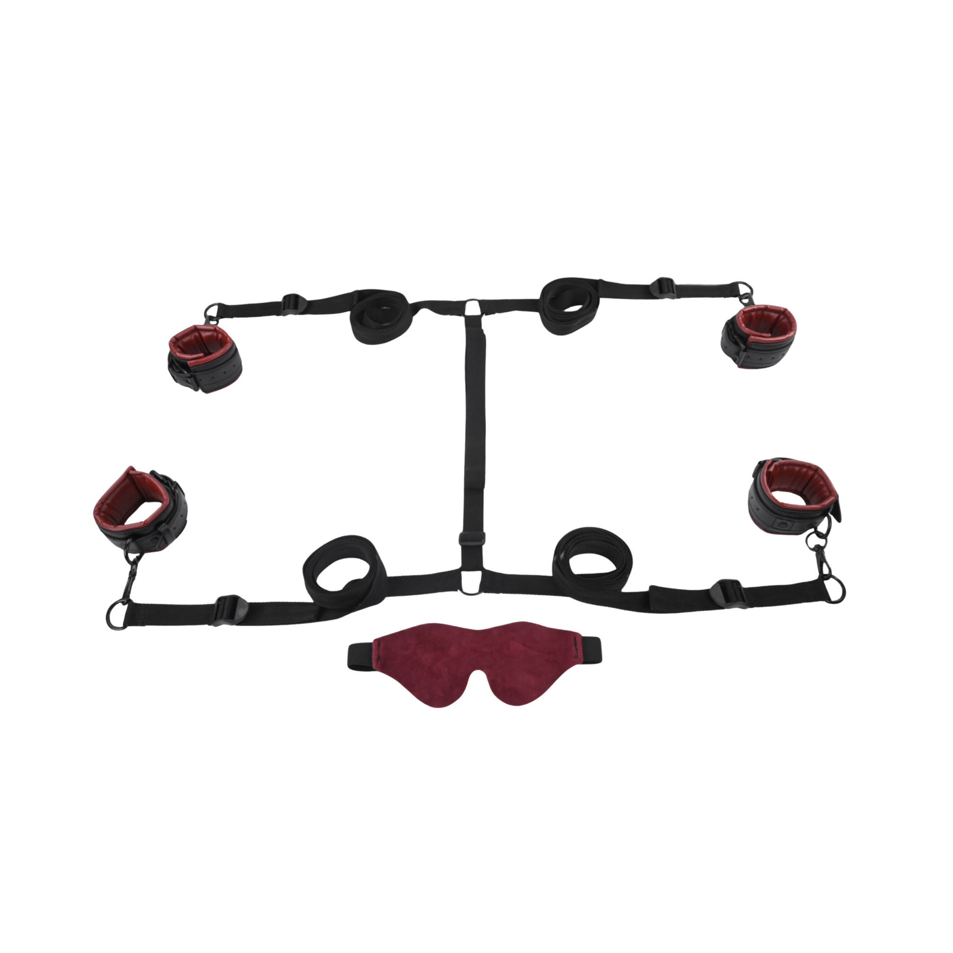 The original (yes, we invented it) Under the Bed® Restraint System just got a sultry and seductive new look! Set up in minutes, the alluring deep reds create a lust filled setting made for the naughtiest play. Four luxurious adjustable cuffs in soft and supple faux leather with restraint straps secure to one center connector strap fitting securely under your mattress. Restrain your lover's arms and legs from the sides or bottom of the bed for an intoxicating experience as you explore their body. The restraint strap quickly fits beneath any mattress with no hooks and adjusts to the size you desire to firmly hold you back on any sized mattress. Use it at home as a removable or permanent addition to your bedroom or take it on the go for a seductive addition to your romantic getaways.