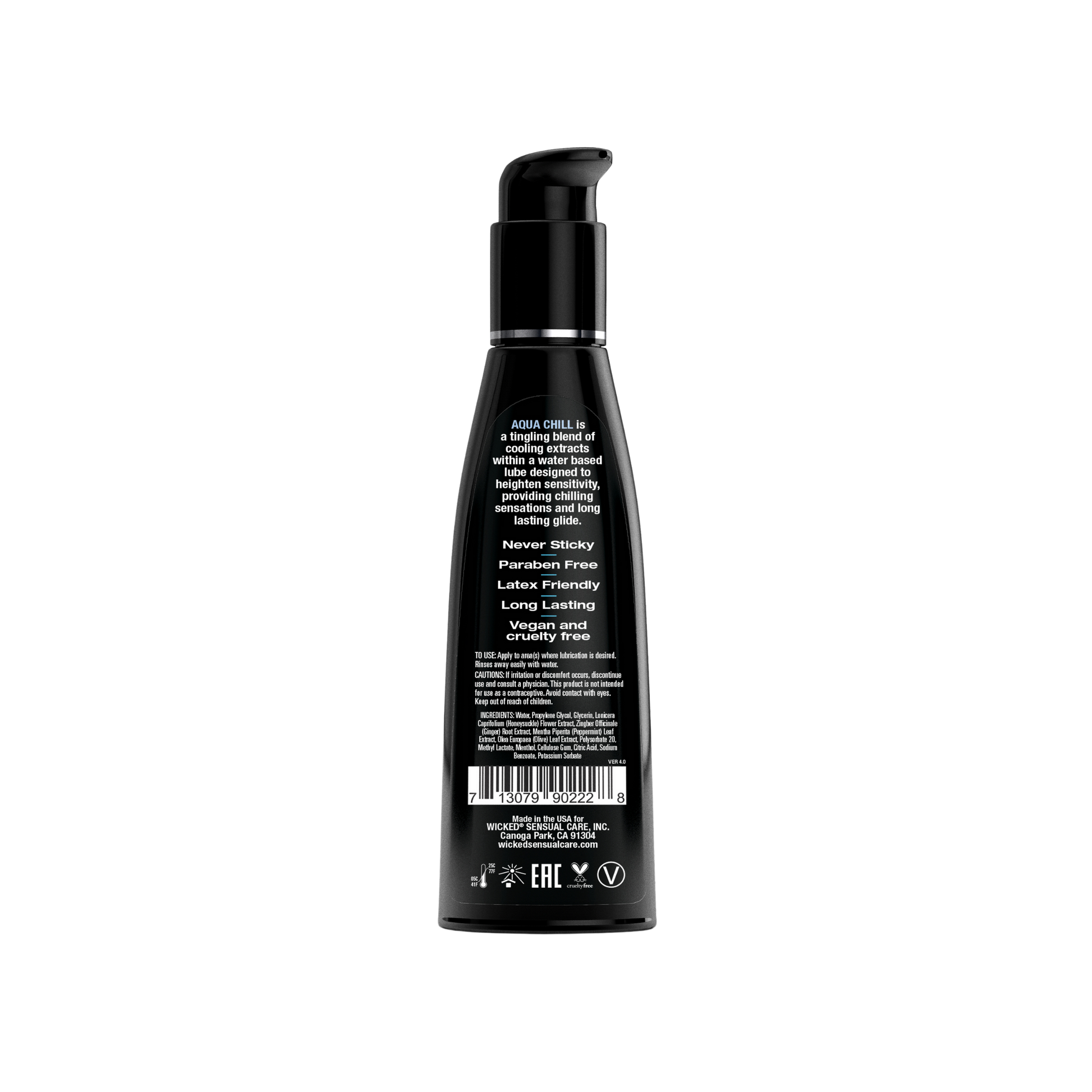Experience the ultimate cooling sensation from Wicked Aqua Chill personal lubricant. This carefully crafted water-based lubricant is designed to keep you cool, even as playtime gets hot. Natural peppermint leaf, ginger root, and menthol blend together to create an exciting tingle that is chilling, thrilling, and satisfying!