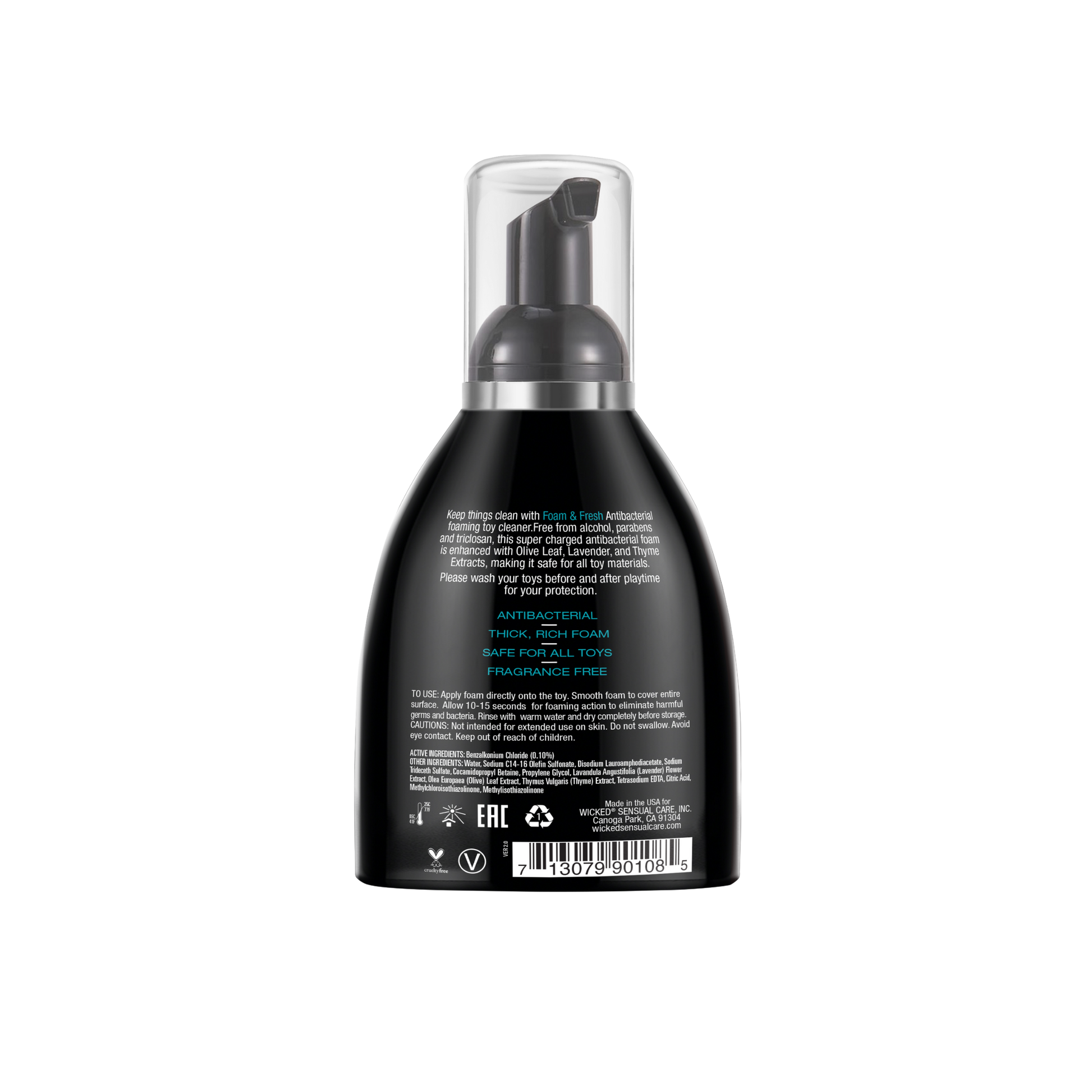 Playtime can get dirty, but your toys should always stay clean. Wicked Foam ‘n Fresh is a toy and body safe alternative to everyday soap and water. Anti-bacterial, triclosan, and alcohol-free, this super powered foam is enhanced with Olive Leaf, Thyme, and Lavender extracts, making it safe for all toy materials yet tough to germs. Use every time it’s time to sanitize, freshen, and protect your intimate investments. This cleaner is a must have for every toy box.