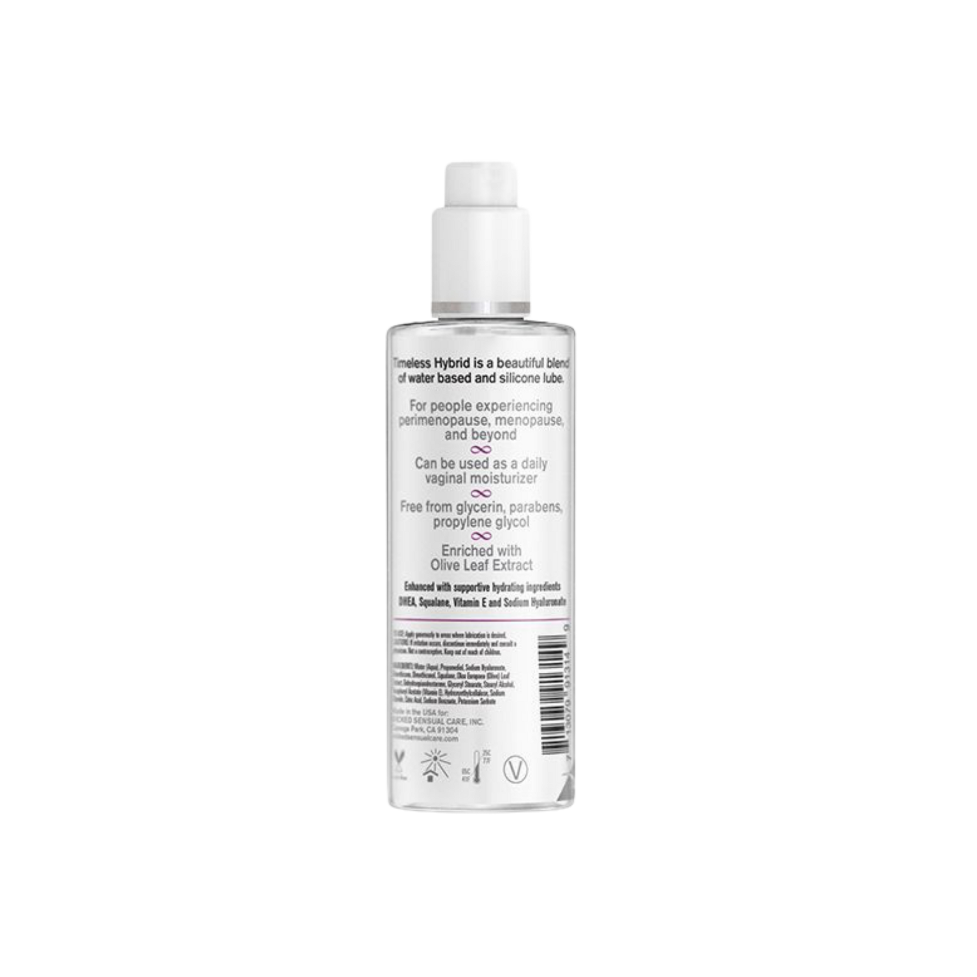 simply™ Timeless lube is uniquely formulated to address the specific needs of individuals during the perimenopausal and menopausal stages and beyond. Each formula contains ingredients that can help alleviate dryness and promote a more comfortable and satisfying intimate experience. Each lube contains supportive ingredients like aloe, olive leaf extract, squalane, and Vitamin E. These supportive ingredients are what makes it different from the rest of the simply™ line. Like all products under the simply™ label, Timeless formulas are free from glycerin, parabens, and propylene glycol. Can also be used as a daily vaginal moisturizer.