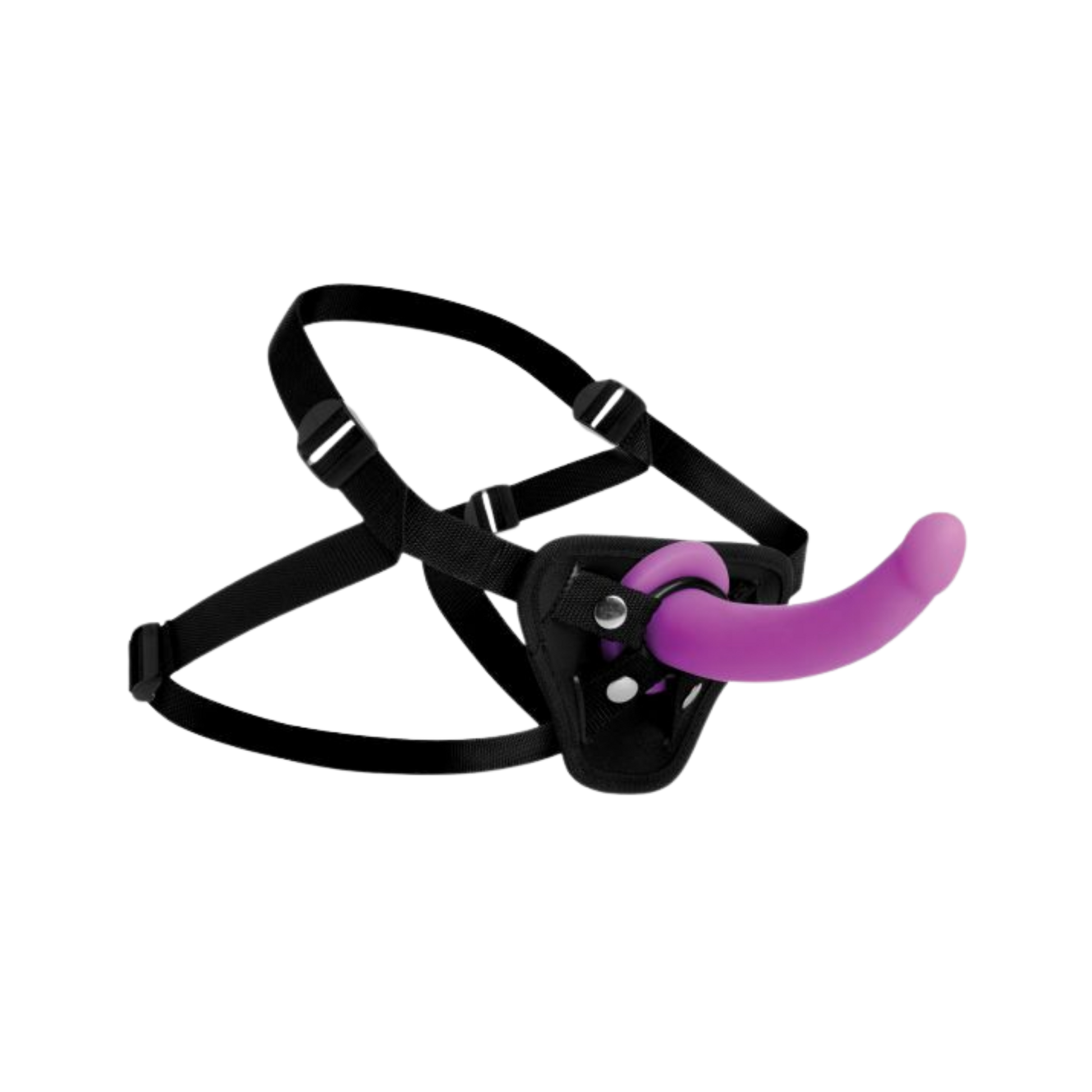 Includes: 1 silicone dildo, 1 adjustable harness (purple)